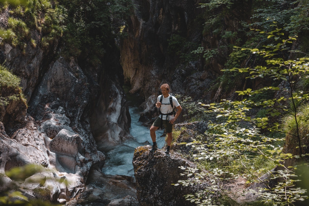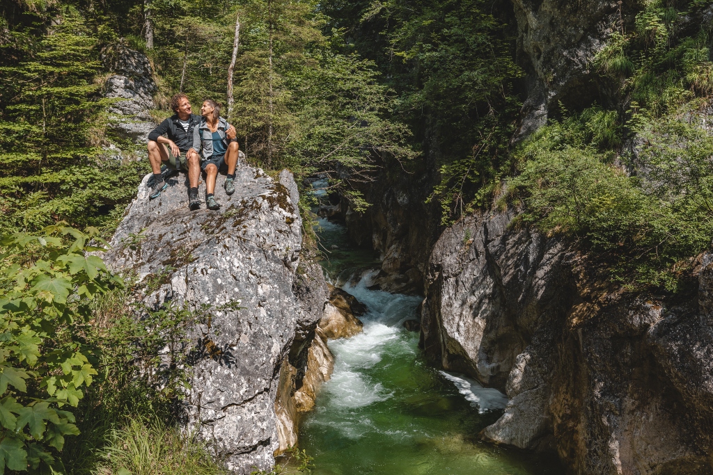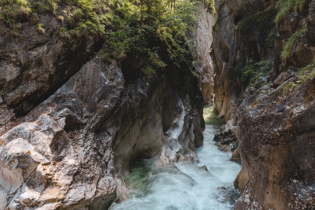 Ein kurzer, flacher Forstweg führt zum Eingang der Klamm. Von hier aus wird der Weg schmaler, steiniger – und deutlich spektakulärer. Links die Felswand, rechts das tosende Wasser und dazwischen ein gut gesicherter Steig, der sich durch die enge Schlucht schlängelt. Je weiter man geht, desto ursprünglicher wird’s. Die Felsen rücken enger zusammen, das Wasser donnert unter einem durch… und trotzdem wirkt alles friedlich. Nach der Klamm öffnet sich das Tal wieder. Die Ache wird breiter, das Gelände flacher – und wer möchte, kann sich auf einer Kiesbank direkt am Wasser niederlassen und die einzigartige Atmosphäre noch weiter auf sich wirken lassen.